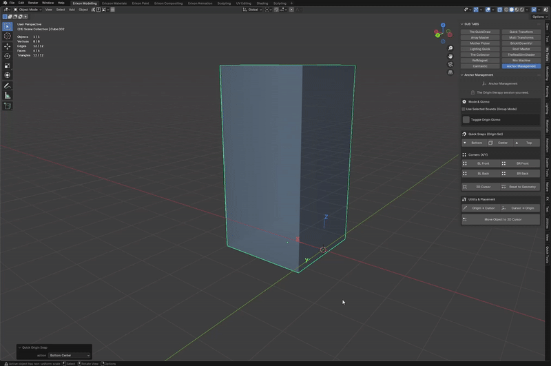 • 8 Quick Snap Positions: Instantly snap your object's origin to any critical point on its bounding box in a single click, including Center, Top/Bottom Center, and all four bottom corners.