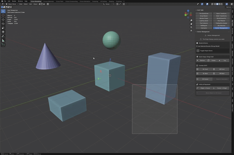 • Origin/Cursor Swaps: Quick-swap tools to move the origin to the 3D Cursor or move the 3D Cursor to the object's origin.