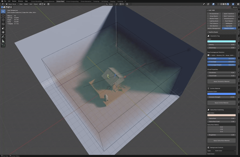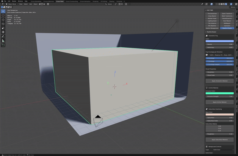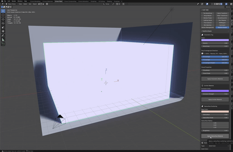 1-Click Material Drop: Instantly apply a full Volumetric Fog, dedicated Subsurface Scattering, or Emitter material to the active object with a single button press.